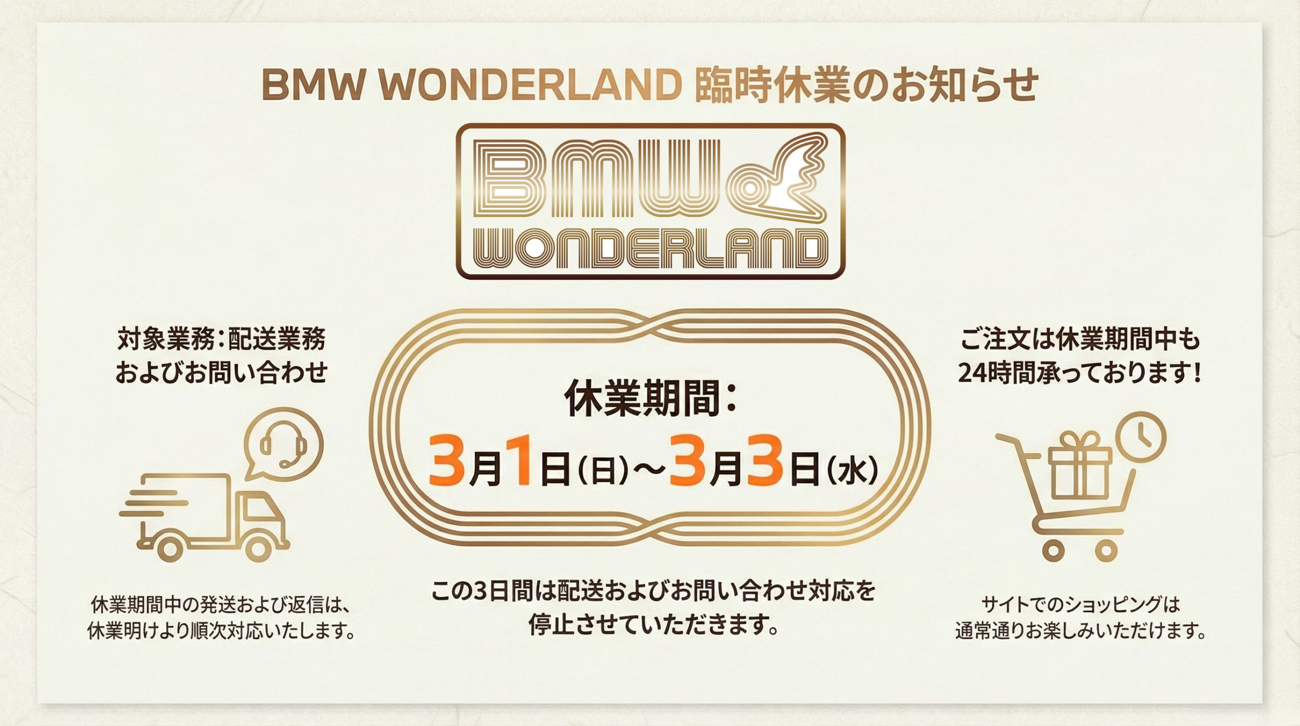スタディ公式オンラインストアBMW WONDERLANDのみ臨時休業を頂戴いたします。 3月1日(日)~3月3日(水)