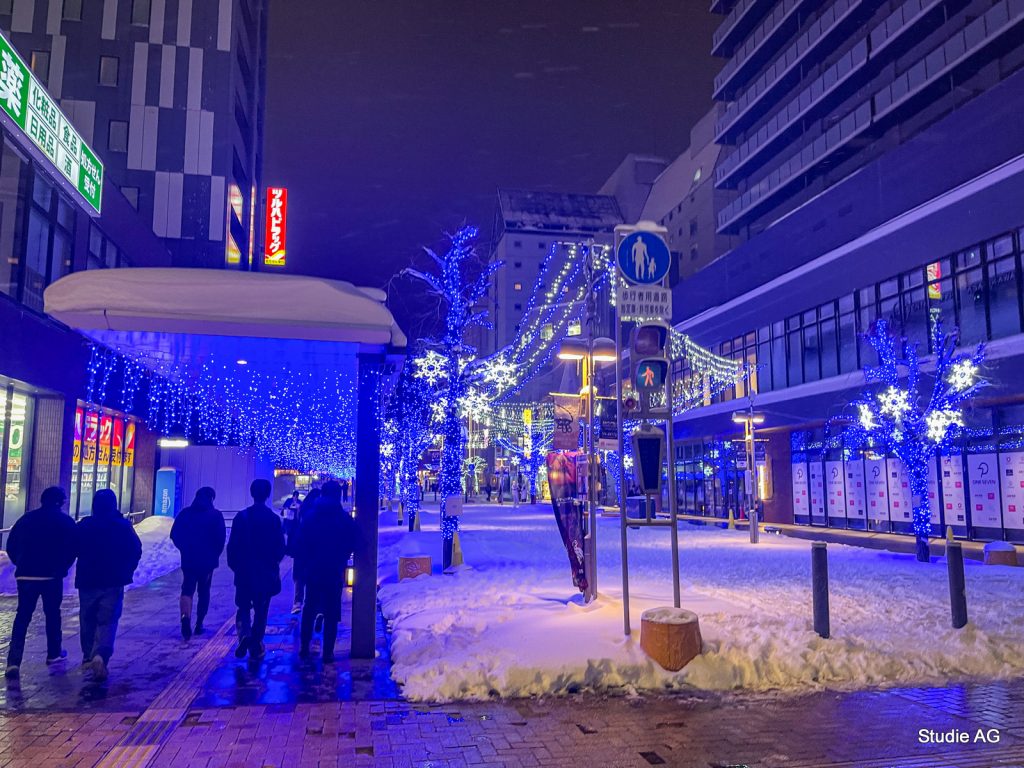 前日の夜は雪まつり開催前の駅前通りと