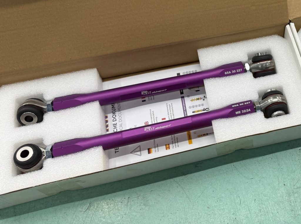 KWのClubSports コントロールアームセットをF87 M2のM/Tモデルへ装着いただきました! ご覧の様に2本で1セットの構成でございます。 よりしなやかに路面の追従性も向上するアイテムでアライメントによる調整もより柔軟に対応できるようになります。サーキット走行のみならず、ワインディングや高速道路と運動性に寄与してくれるものでございます!