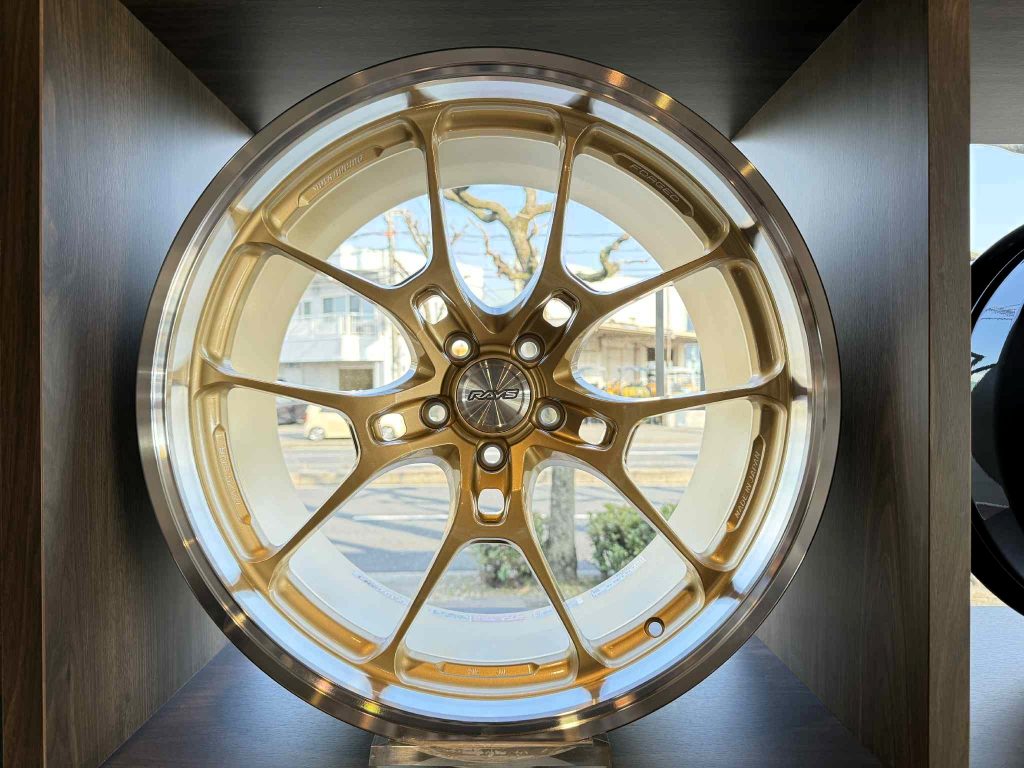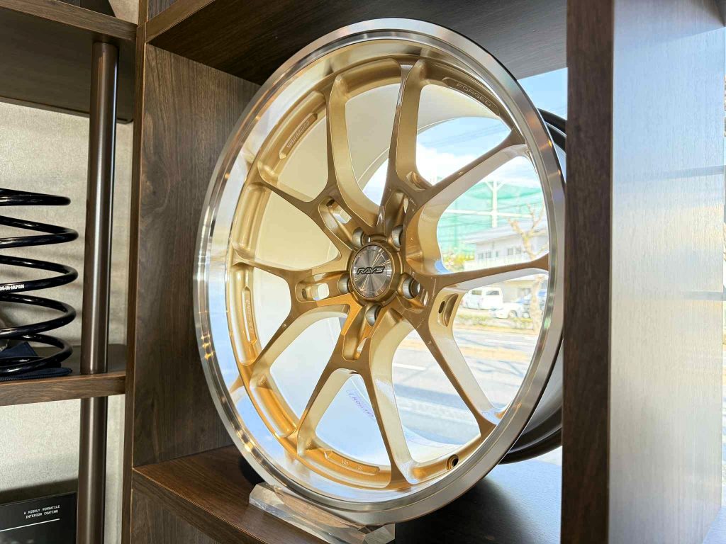 切削加工で鋭いスポークは製作工期が掛かるところもうなずけます。在庫がございますのでお車の横に置いてイメージしていただく事もできます。