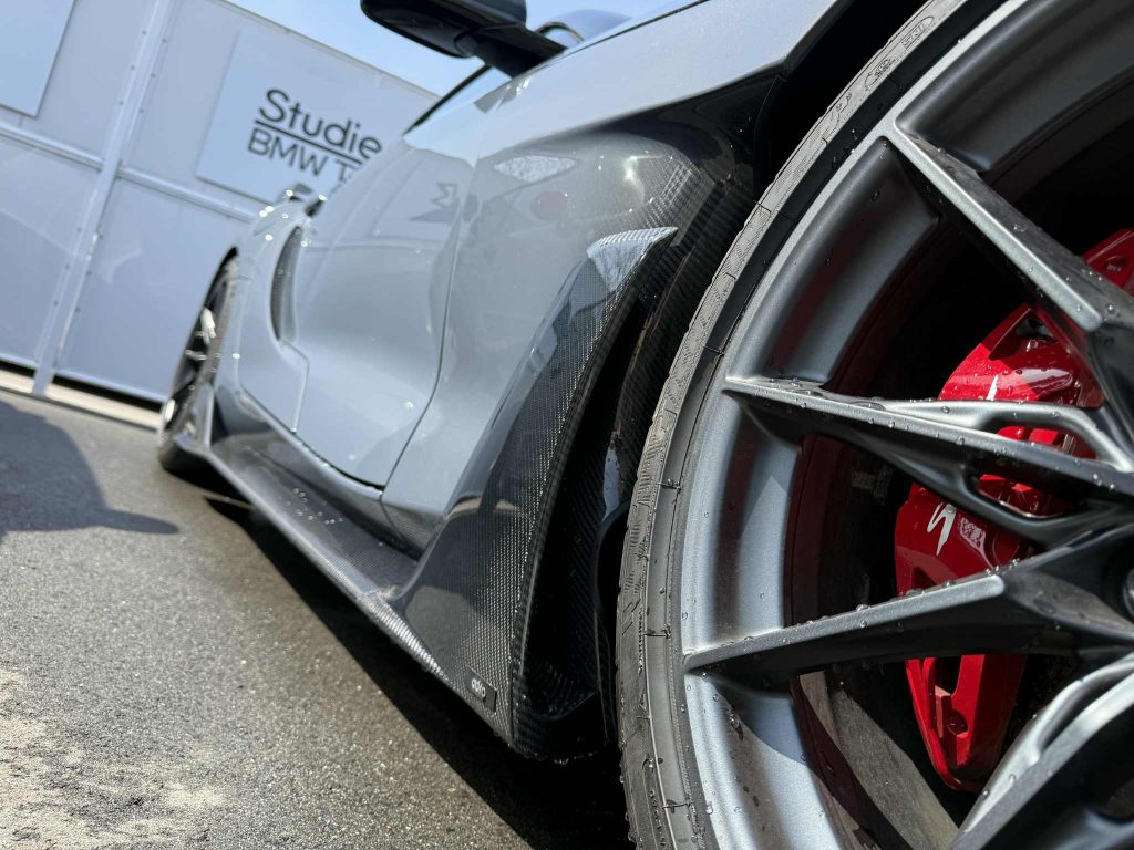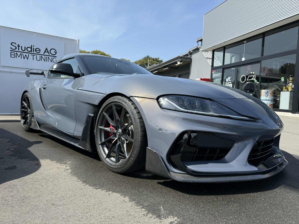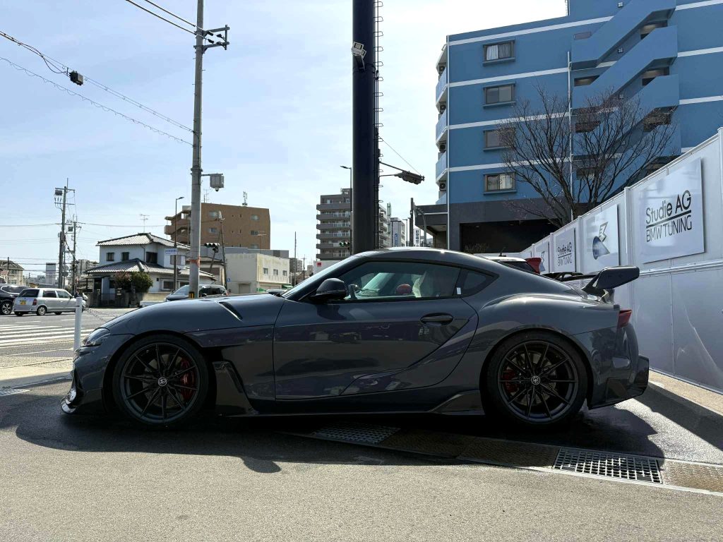 こんばんはスタディ神戸の池上です! 昨晩のG80LCI M3 Competitionに続き今夜もカッコイイお車をご紹介! G29 Z4と兄弟車のトヨタGR Supra RZにエアロダイナミクスの魔術師 adro社のカーボンファイバーサイドスカートV2を装備いただきました!過去にもご紹介したフェイスリフトバンパーやウイングなど装備いただきましたOwner様のGR Supura RZでございます。今回も会心の一撃でadroカーボンフェンダー部分をボディカラーのボルカニックグレーでカーボンからボディカラーへグラデーションで仕上げました。 ボルカニックグレー特有の光の入り方や反射の仕方で発色が変わり印象深く残るところもこちらのGR Supraの魅力でございます(^_^)