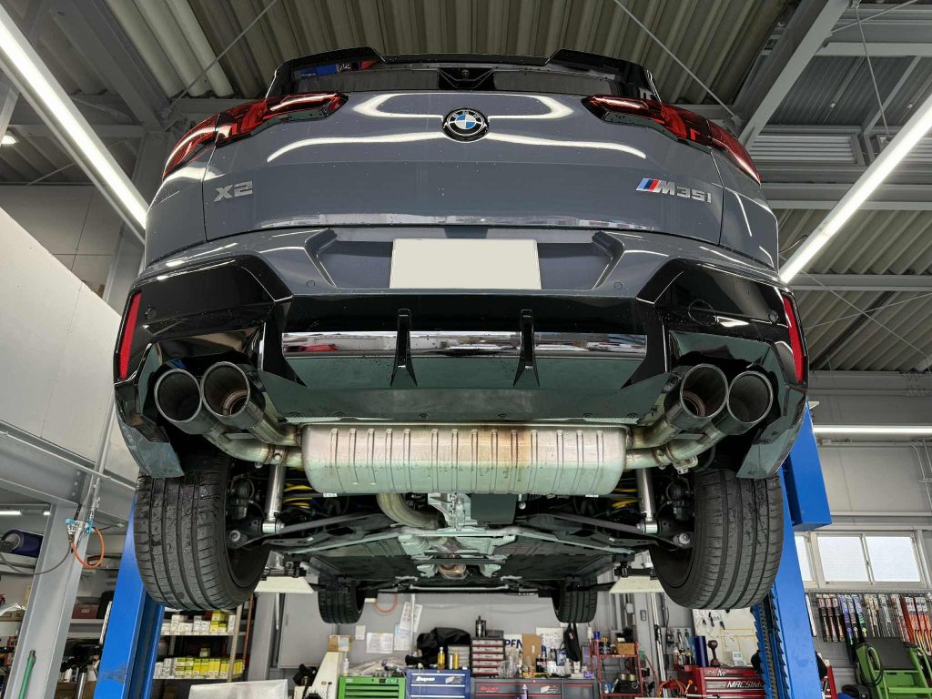 こんばんは、スタディ神戸の池上です。スタディ横浜本社よりBMW WONDERLAND忰部が神戸店で週明け月曜日まで勤務となりました。BMW WONDERLANDをご利用いただくOwner様や1月の東京オートサロンでもお会いしておりましたOwner様からもお声がけを頂きありがとうございます! また変わった状況の神戸店でございますがPIT作業ではカスタムを楽しんで頂いているOwner様のX2 U10型のM35iへREMUS(レムス)エキゾーストシステムを装備いただきました。 欧州でも排ガス規制が厳しいくその為、排気音量が上がりにくくなっておりますが何とか打破すべくREMUSよりU10 X2 M35iにマフラーが登場致しました。兄弟車種のU11 X1 M35iも装着OK♪
