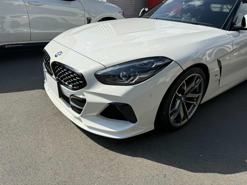 こんばんはスタディ神戸の池上です。本日は3DDesignフロントスポイラーを装着いただきましたG29 Z4 M40iのご紹介でございます。 ウレタンタイプを装着でボディカラーのアルピンホワイトで同色仕上げ一体感のある仕上でございます。