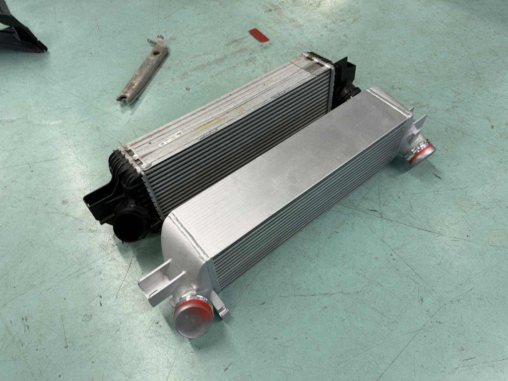 こんばんは!スタディ神戸の池上です。弊社スタディオリジナルのインタークーラーをF40 M135iへ装着いただきました。このインタークーラーは兄弟モデルのF44 M235iGCとMINIのF54LCI JCWクラブマン(306PS)にF60LCI JCWクロスオーバー(306PS)にも装着可能なインタークーラーでございます。純正インタークーラーと比較しまして26%容量アップ、エアフロー(空気量)6%増加し圧力損失を改善してエンジンパフォーマンスを向上させてくれます。