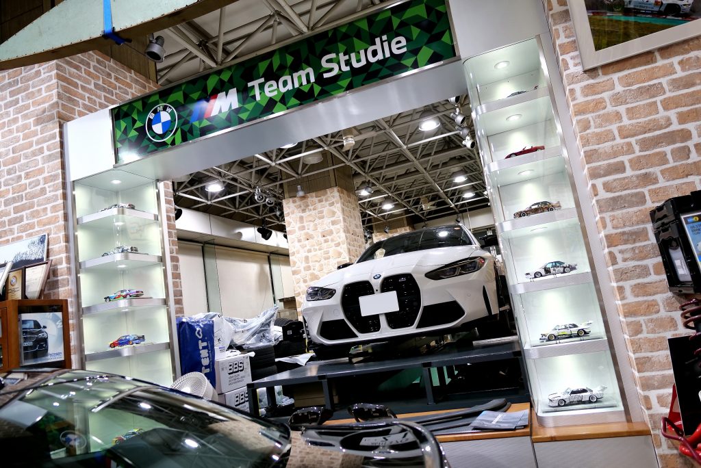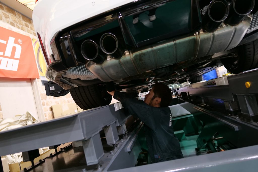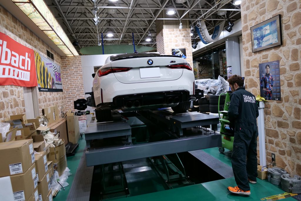 裏側へ回ると作業状況もご覧いただけます。多くのBMWは前後のトーの調整と、後ろのキャンパーの調整ができますが、アライメントが狂うと直進安定性の悪化やタイヤの偏摩耗などに繋がりますので1万kmくらいのサイクルでの施工をオススメします。