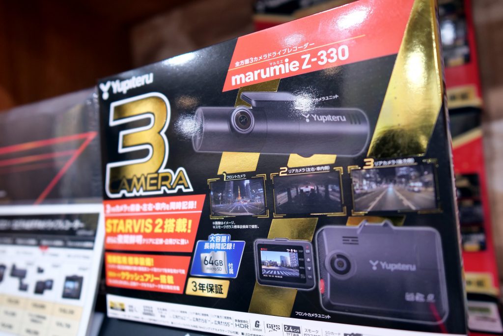 こちらは一番人気のドラレコ、ドライブレコーダーです。ユピテル製の指定店専用モデルのZ-330。カメラは前後2カメラながら、後方カメラに2つのレンズがあり、車両の側面も録画してくれますので安心です。夜間も綺麗に録画!