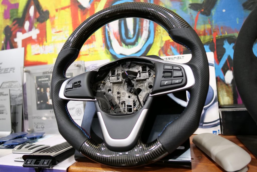 こちらはカスタムステアリング、VERSPIELT(ファスピエルト)のF45/F46のノーマル(非Mスポーツ)エアバック車両用になります。上下がカーボン、左右がパンチドレザー、そしてMステッチ入り。