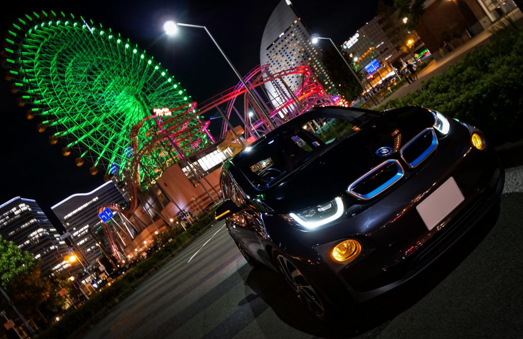 昼に夜にと試し撮りをしたのですが、ここに出す2枚は最終的に候補から外れたもの。夜の写真は雰囲気は好きなのですが、i3のボディラインを夜に綺麗に出すのは本当に難しくて(汗)。もう1枚は目元からボンネット~バンパーにかけてのデザインは出せたものの、もう一捻り足りない感じで…。