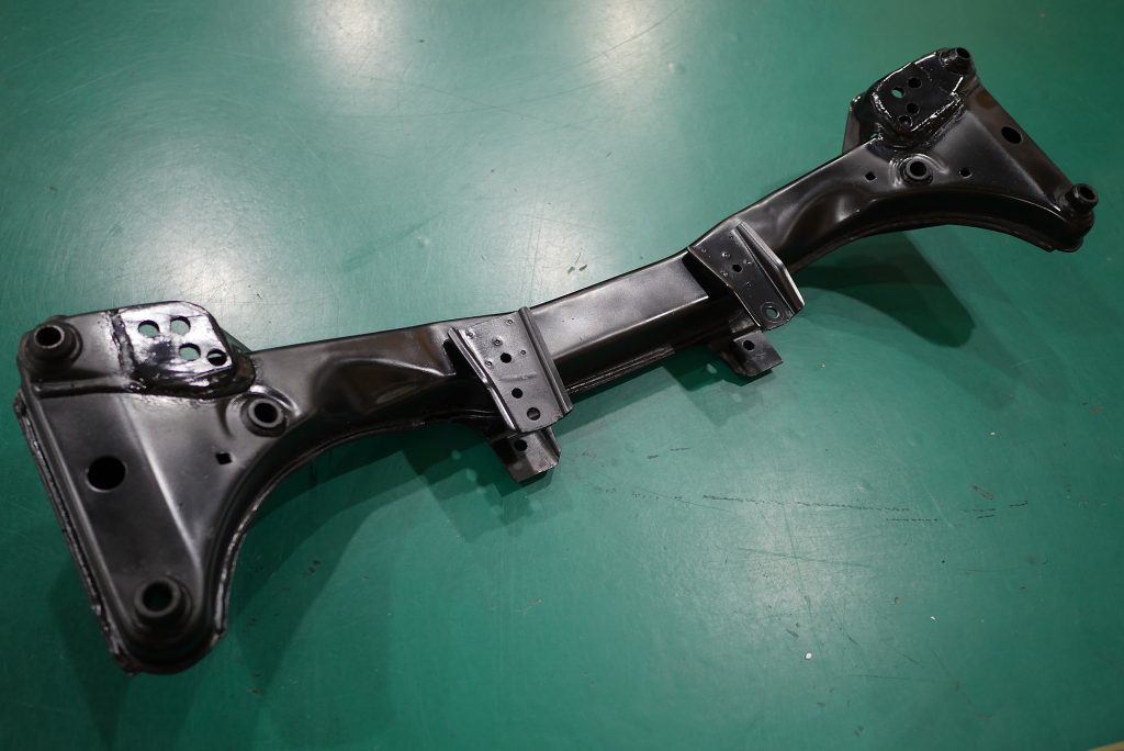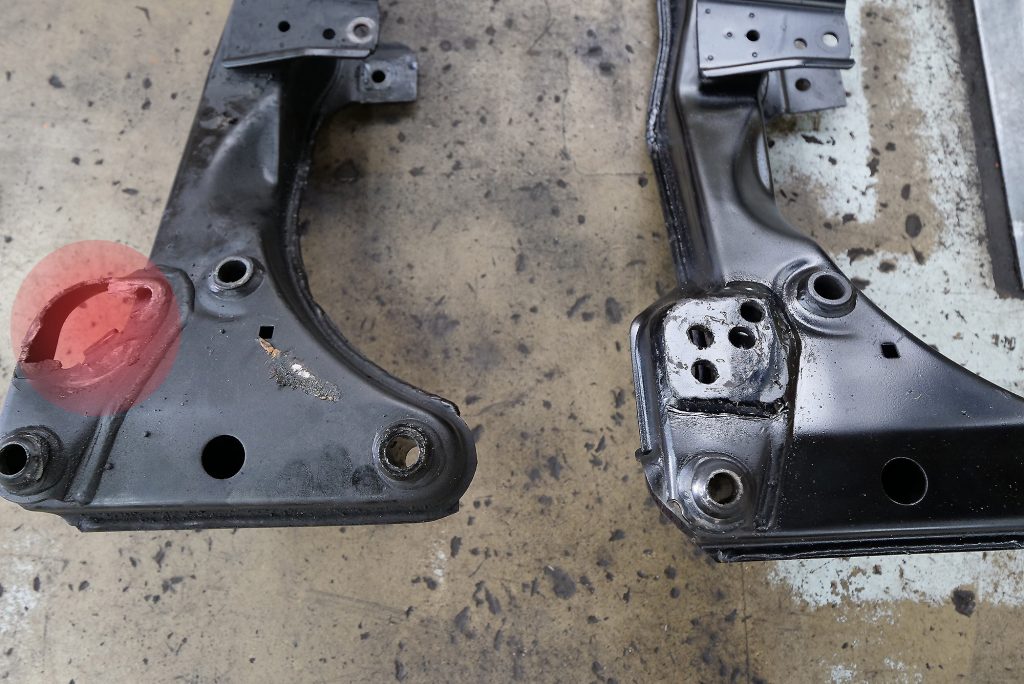 さらに整備の途中で発見されたのが、フロントメンバーの破損。走りのマシンで、この年代生まれとなると、このようなクラックなどはそこそこ発見される症状ですが、今回は左右ともに欠け落ちてしまっている状態でした(^_^;)。もちろんこの部品も新品は入手不可…。それでも代替部品を探し出し、板金補強を施すことで無事交換することができました。
