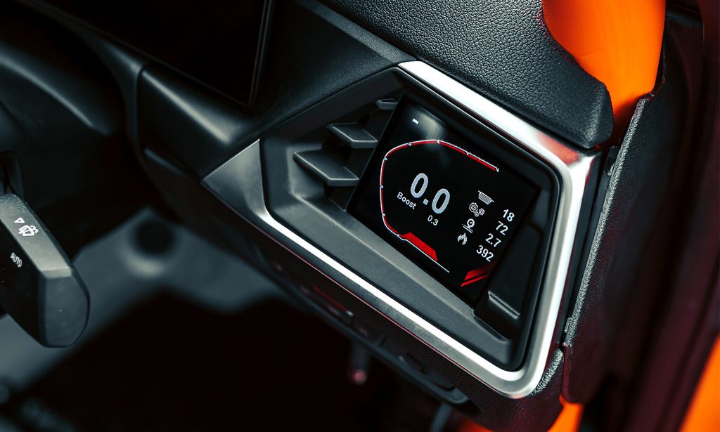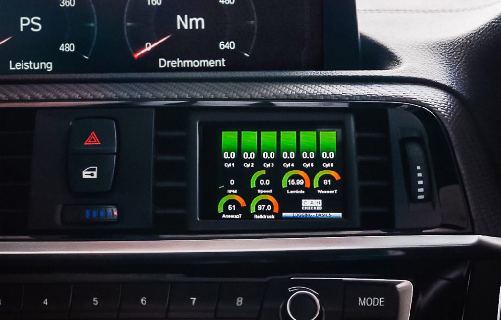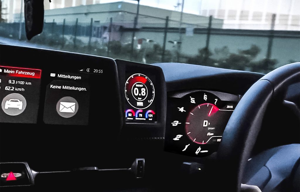 主な表示項目はエンジン水温、吸気温度、排気温度、トランスミッション温度、ブースト圧、周囲圧、油圧、ラムダ値/混合比、MAF(吸入空気量)、エンジン負荷、トルク、ドライバーダイナミクスではブレーキ圧、車速、スロットル角/アクセルペダル位置など。そのほか、速度・点火角・ギア・バッテリー電圧など。