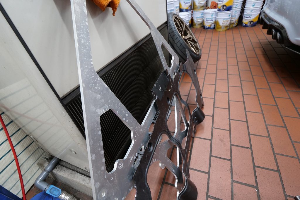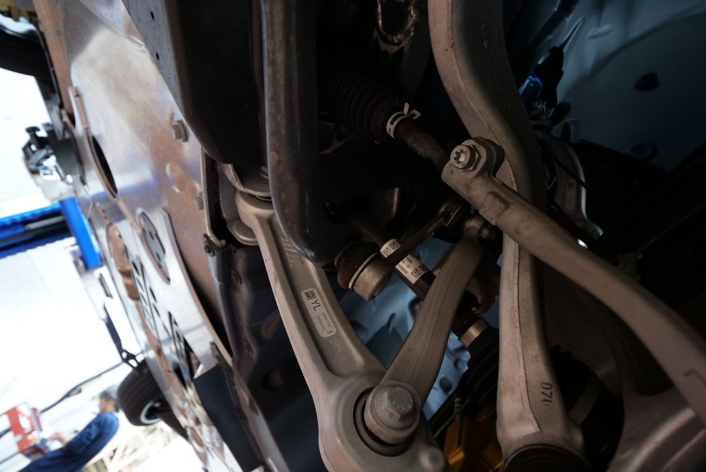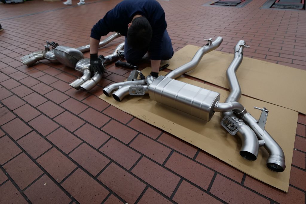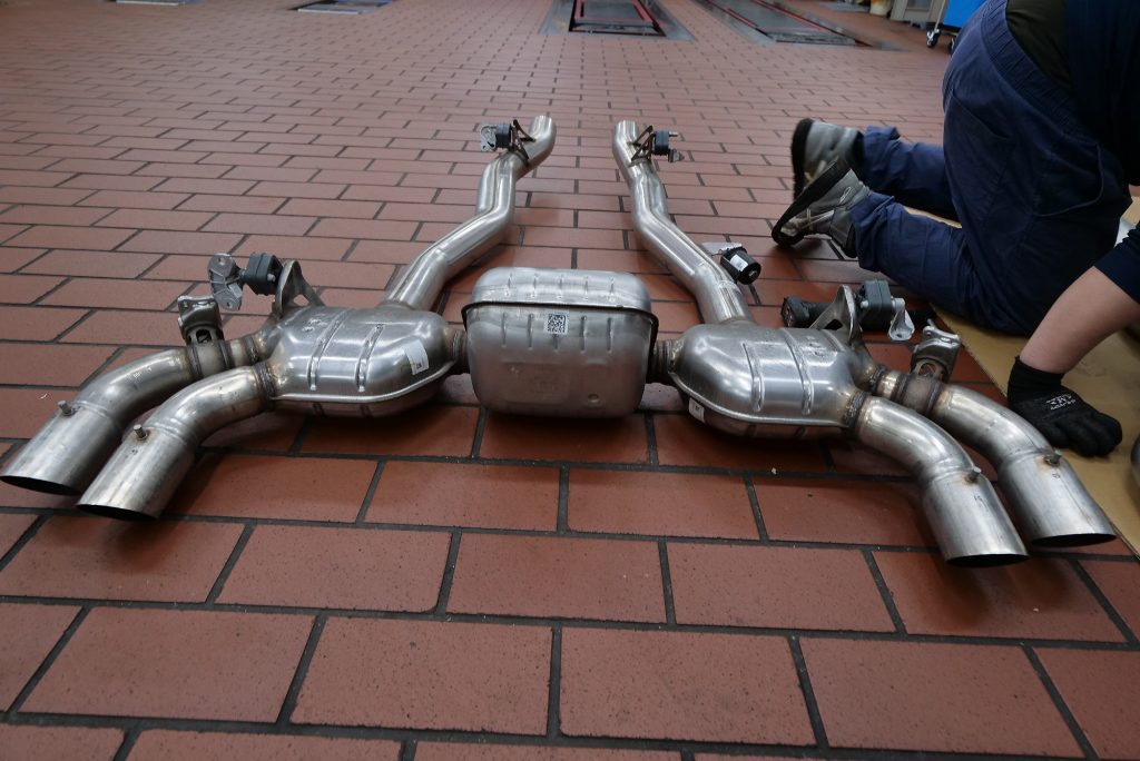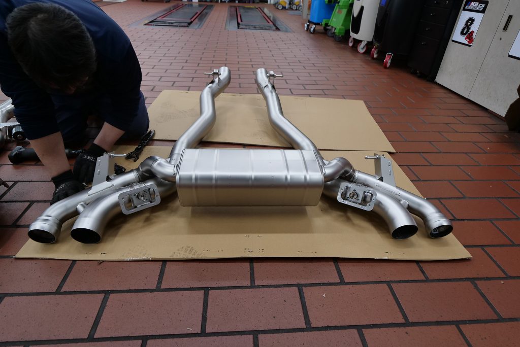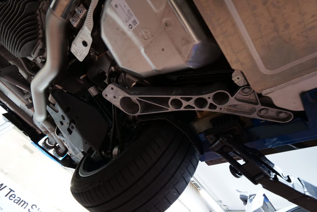 自分としてはNEW M5にAKRAPOVICが装着されるのを見るのは今回が初めてでしたが……まずリフトアップされたM5の“裏側”に萌えます(笑)。剛性たっぷりのアーム類が放つオーラは、ほかの車種と見比べてもやっぱり別格。各部の補強パーツもしっかり入っていて、“このクルマが受け止めるトルクとパワーってどれだけだよ…”と感心するほどの仕上がりです。