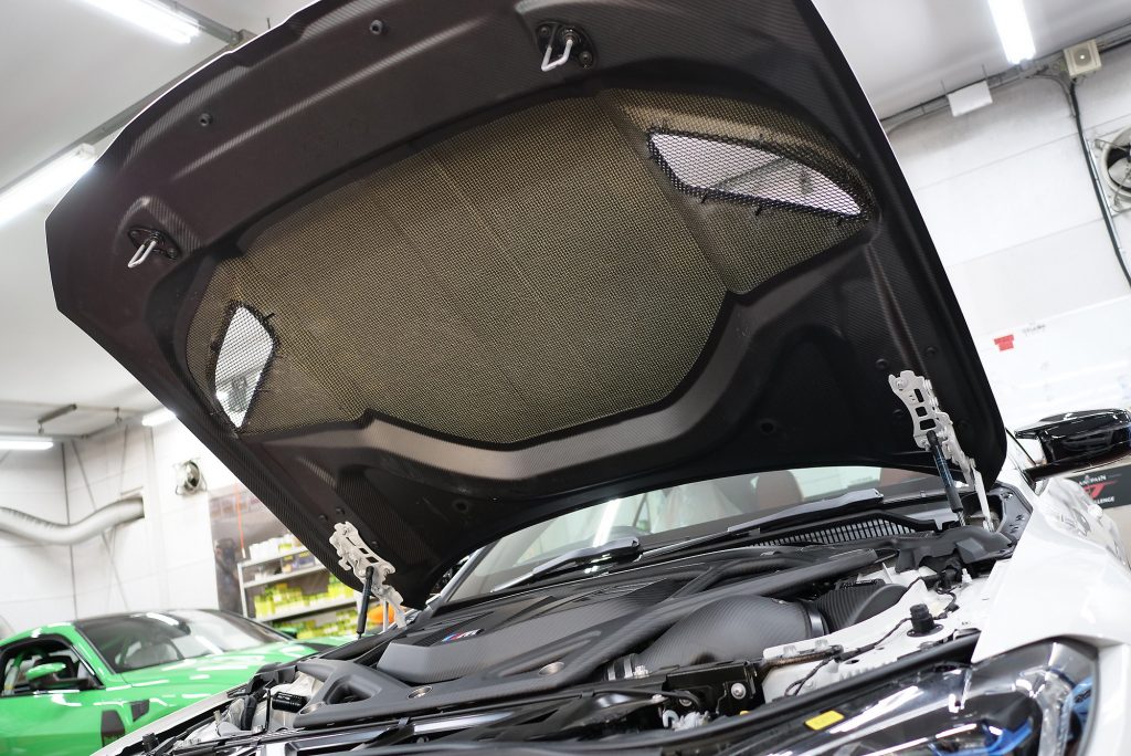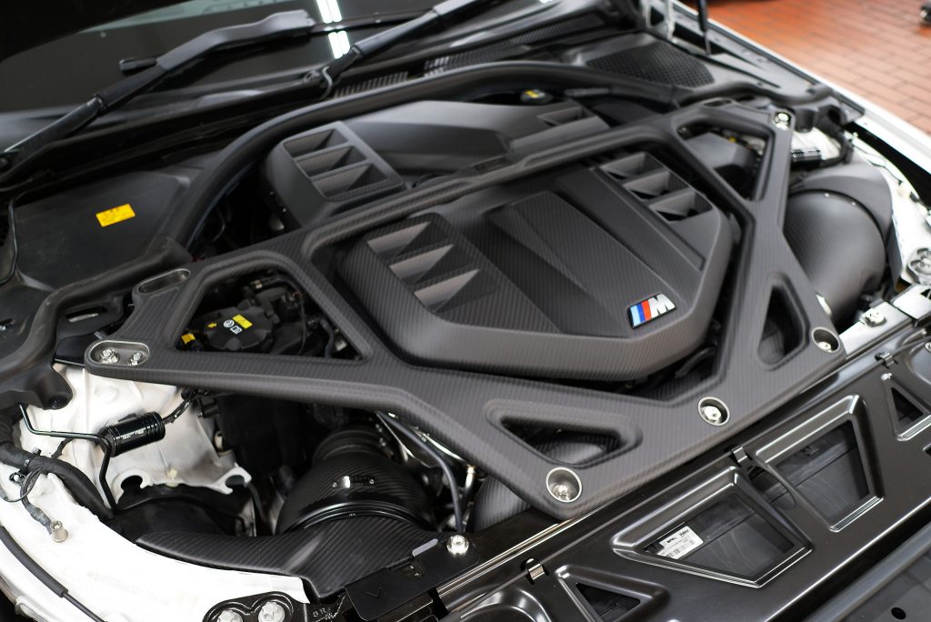 ベースはG83 M4。adro V2エアロを身にまとったミネラルホワイトの艶ボディ。オープン時はもちろん、クローズ状態でも独特の存在感を放ちます。そこに組み合わされるのが、EVENTURIのエアクリーナーキットと、カーボン製タワーバー。シャシー剛性とビジュアル、どちらも抜かりなし。