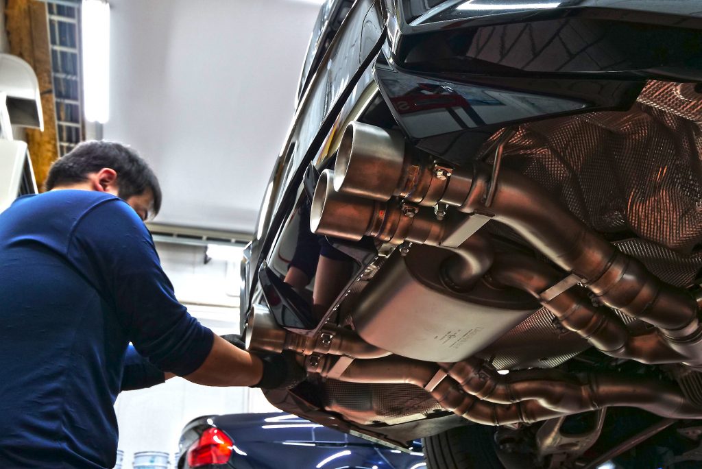 BMW G87 M2へREMUSマフラーのインストール! そしてお隣のピットでは車種こそ違えど3D Designマフラーのお取り付けと、まさに“サウンド・チューニング日和”な一日となりました。あ、もちろん排気効率UP実現です。