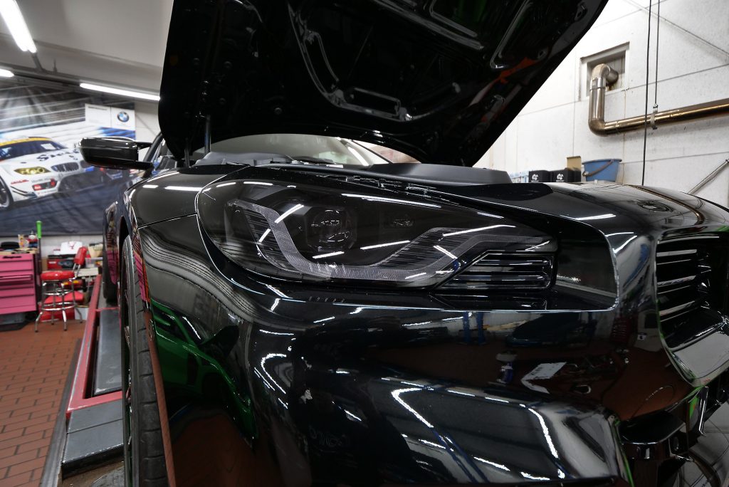 ヘッドライトはDiamond Swell プロテクションフィルム Black Grayでトーン落として、高級感もUP! さらにバンパーネットやナンバー下げ