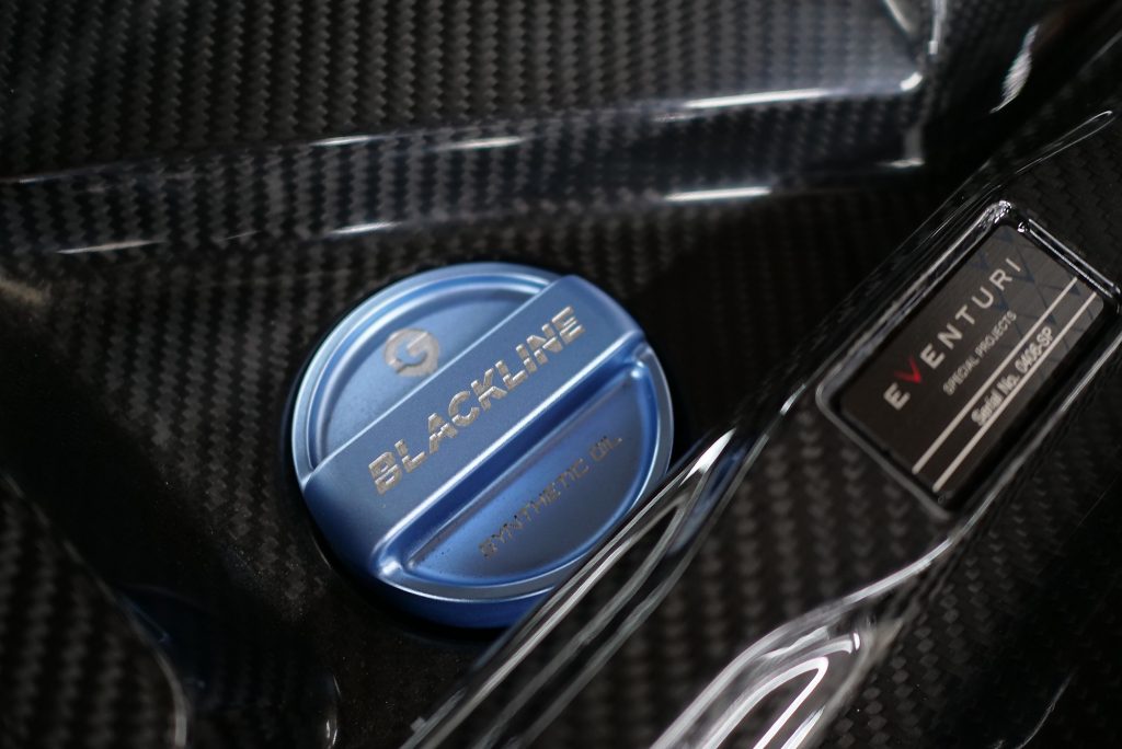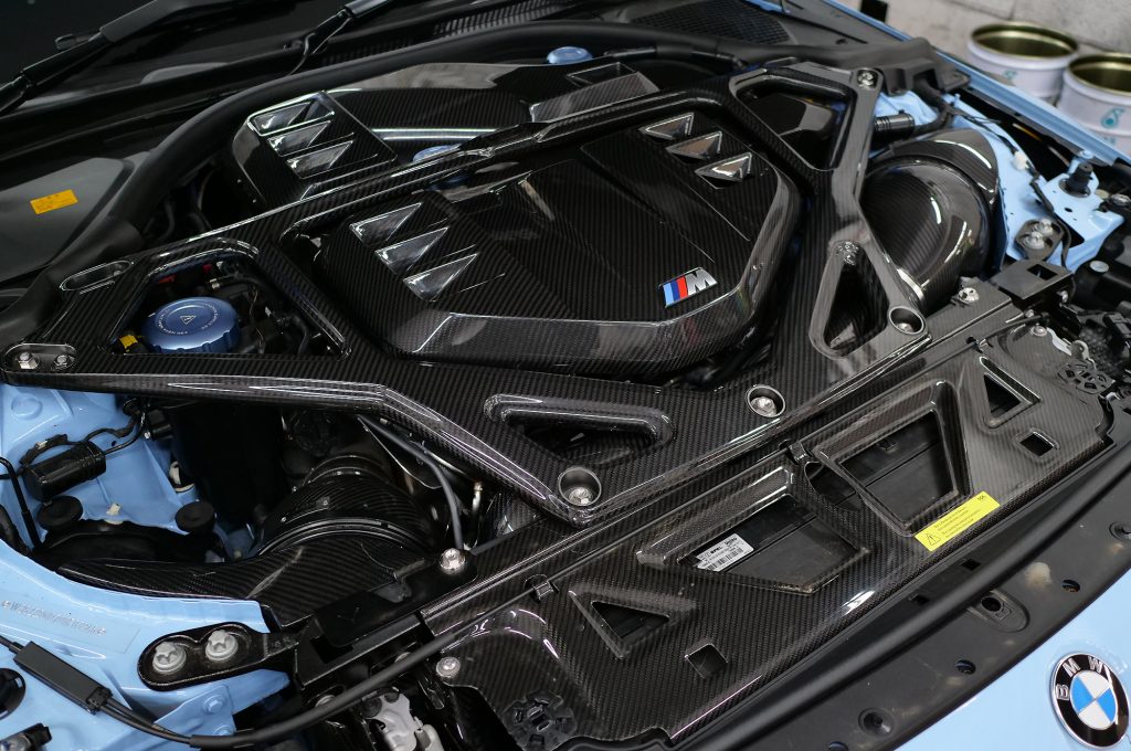 さらにカーボンのタワーバーも存在感抜群で、エンジンルーム全体の雰囲気をグッと引き締めてくれます。フロントまわりではINDIVのシュラウドカバーやブラックラインのOIL CAPなど細部までボディ同色を用いたりと統一してクールな仕上がりに。