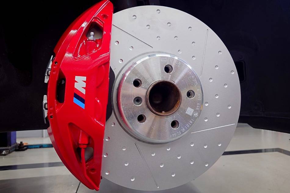 赤いブレーキキャリパーの中央にはMのロゴ、大きなディンプル&スリットが入ったディスクローター、・・・