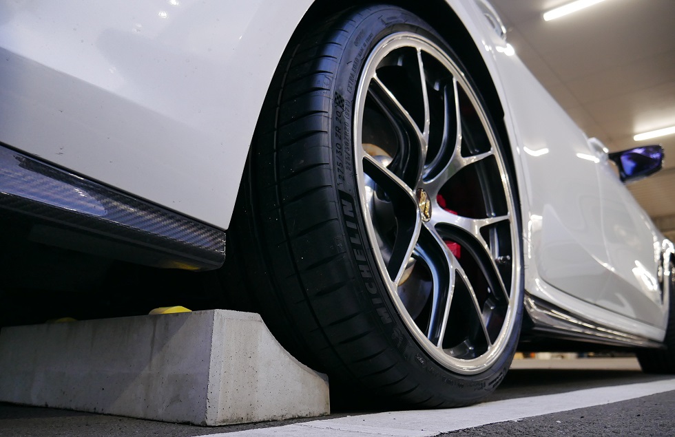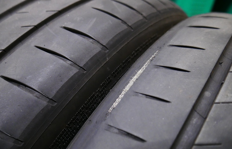 右側は既にワイヤーも露出しており、いつバーストしてしまってもおかしくないヒヤヒヤな状態でした。偏摩耗を引き起こしてしまう要因としては、空気圧不足、アライメント値の狂い、コーナー攻めすぎ・・・、等がございますが、定期的な空気圧管理や摩耗点検、ローテンション(一部車両で可能です)、アライメント調整等でタイヤの寿命も伸ばせます。