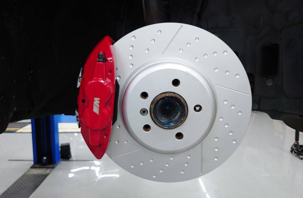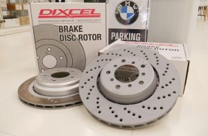 (BMW M PERFORMANCEブレーキキットでは、ディンプル&スリットの入ったディスクローターが標準となっていますが、同等の製品がDIXCEL社でも適合がありますので、純正ローターと比べるとリーズナブルな価格になります♪)