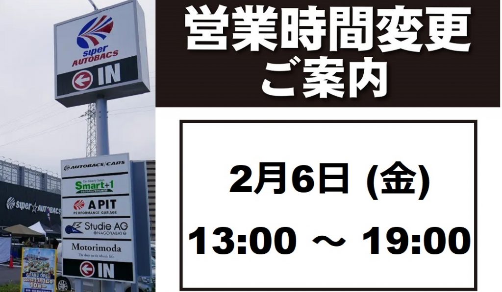 スーパーオートバックスさんの社員研修のため、2月6日(金)は営業時間を13:00~19:00とさせていただきます。