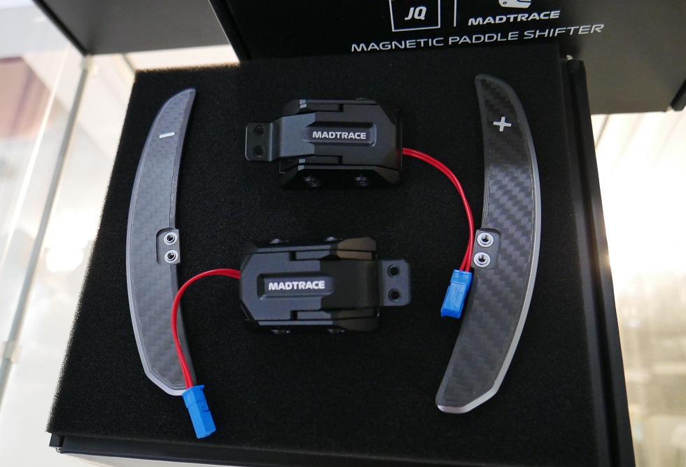 パドルレバー表面がマットカーボン、裏面がアルミ製のハイブリッド仕様。またマグネット式の専用スイッチが付属されており、カチカチと、レーシングカーのような操作感のパドルシフターです!
