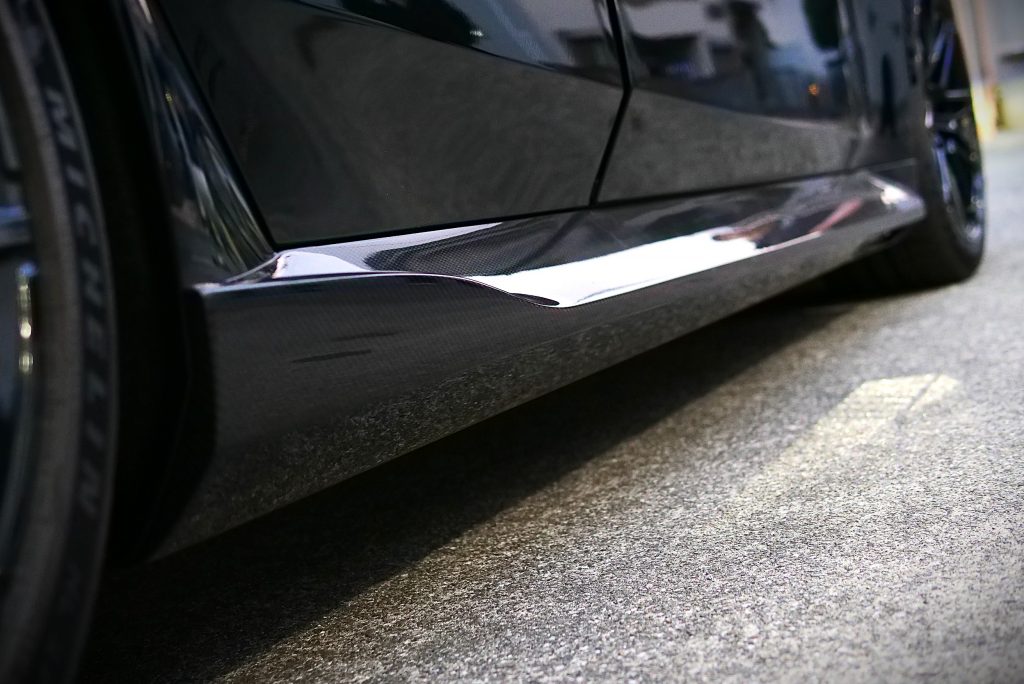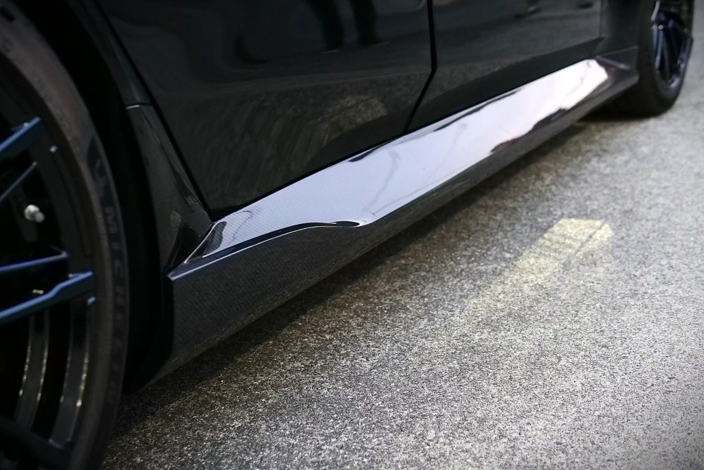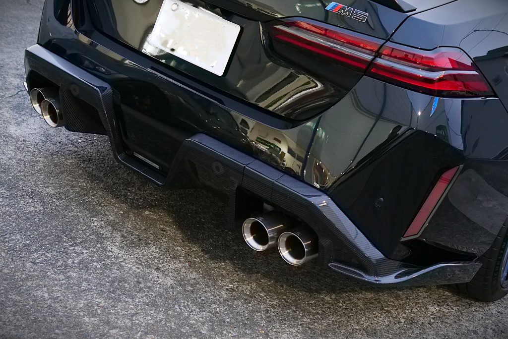 フロントスポイラー、サイドスカート、ディフューザー、トランクスポイラーとどこをとっても素材のG90M5を引き立たせるスパイスの効いた3Dデザインらしい造形がシンプルにカッコいいっ!
